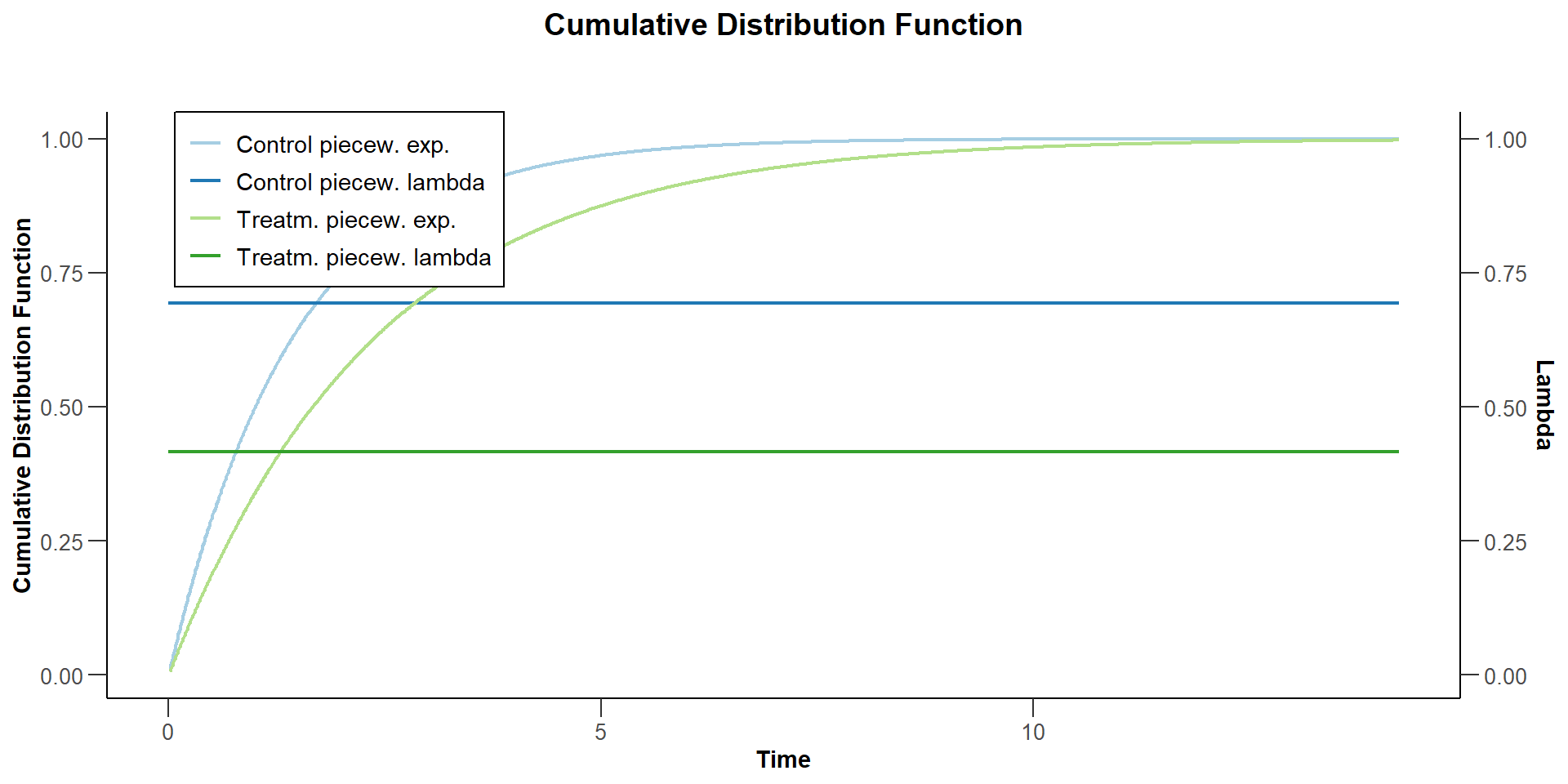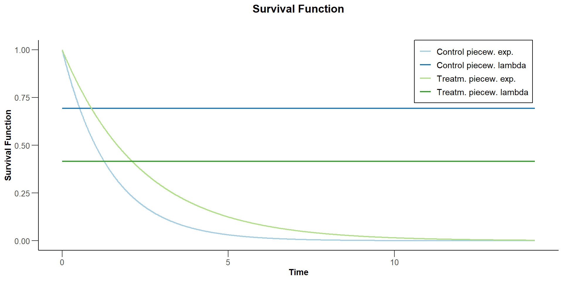Suppose now that the control arm follows a piecewise exponential distribution. For the first year the hazard rate is log(2) / 1 = 0.693, and thereafter the hazard rate is 0.5.