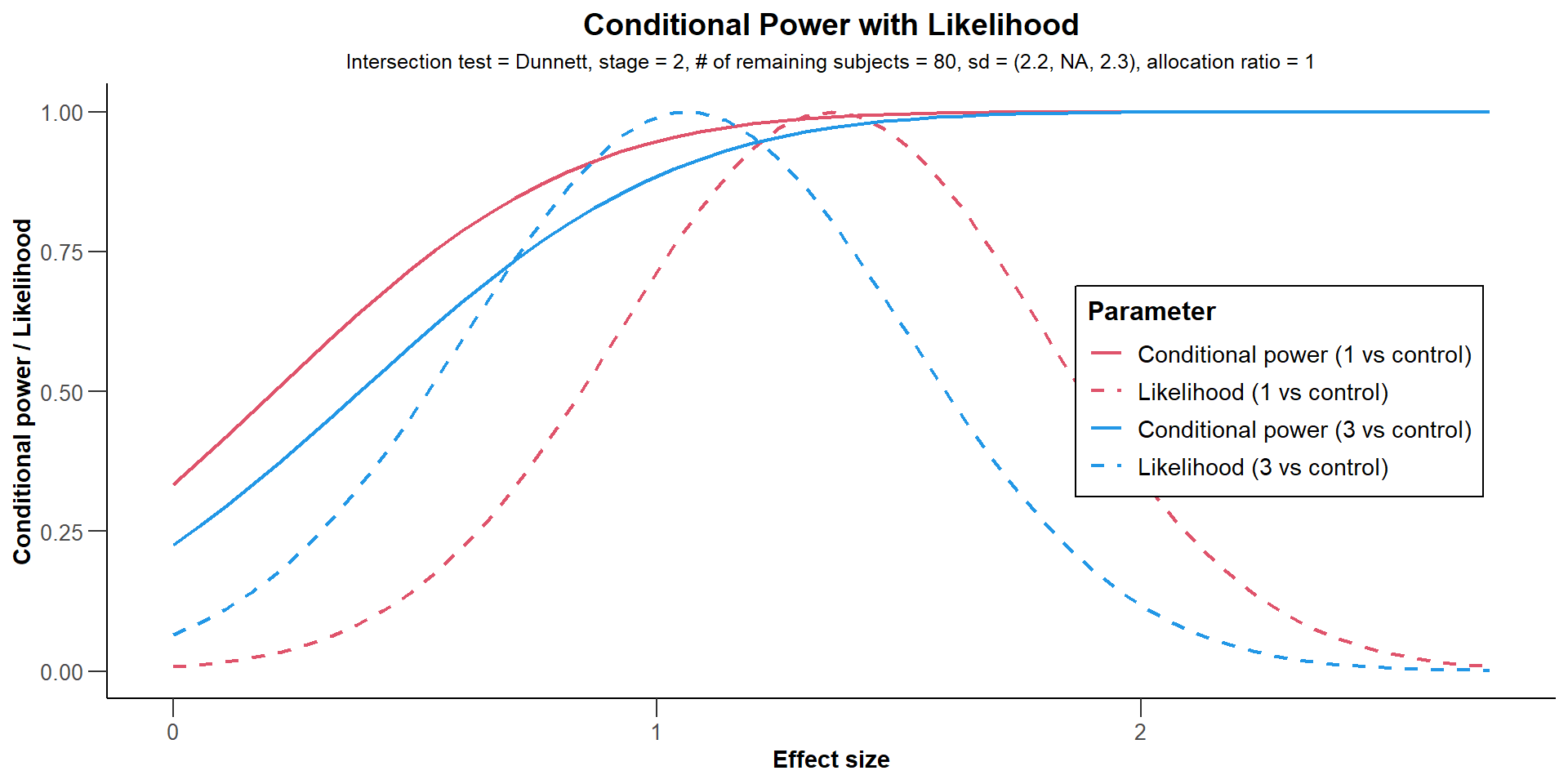 Sequential analysis with 3 looks (inverse normal combination test design), one-sided overall significance level 2.5%. The results were calculated using a multi-arm t-test, Dunnett intersection test, overall pooled variances option. H0: mu(i) - mu(control) = 0 against H1: mu(i) - mu(control) > 0. The conditional power calculation with planned sample size is based on overall effect: thetaH1(1) = 1.36, thetaH1(2) = NA, thetaH1(3) = 1.06 and overall standard deviation: sd(1) = 2.18, sd(2) = NA, sd(3) = 2.29.