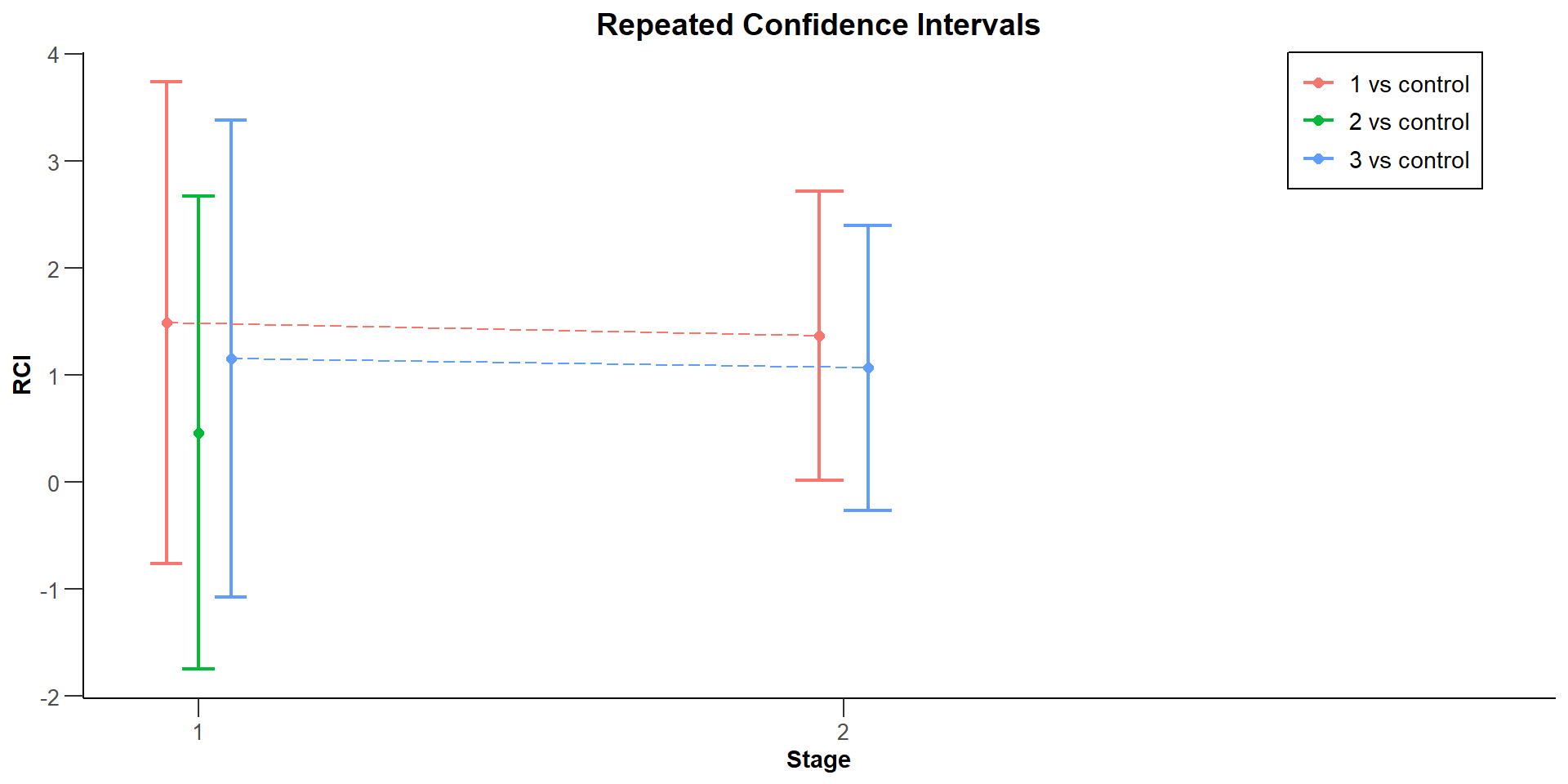 | 95% repeated confidence interval (1) | [-0.763; 3.743] | [0.014; 2.719] | |